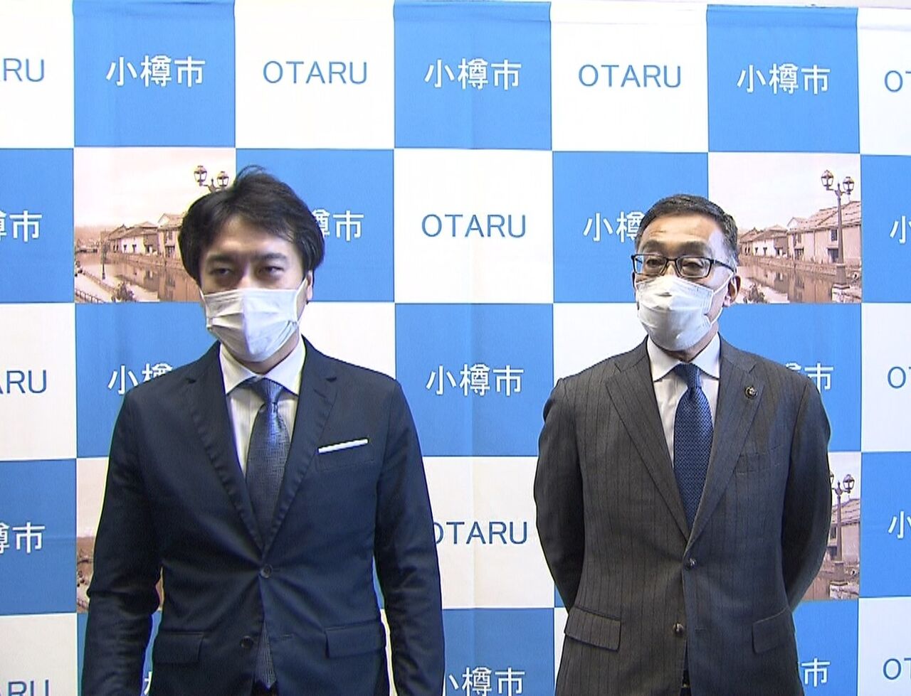 出馬表明をした(左側)余市町長選の斉藤啓輔町長と(右側)小樽市長選の迫俊哉市長(1月20日の小樽市役所での三者協議にて)🐻👍【小樽市長選挙❕】