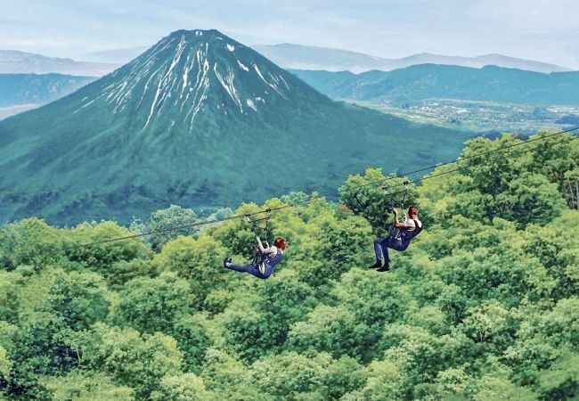 スキー場の斜面を使い、空中に張ったワイヤロープを滑り降り、スリルと眺望を楽しむ。運営する香港系の日本ハーモニー・リゾートによると、総延長は約2・6キロでアジア最長という。