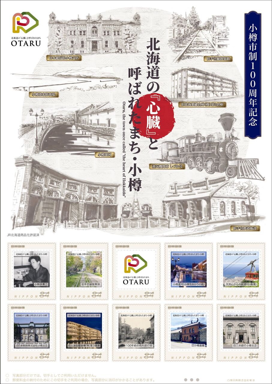 小樽市制100周年を記念して、「北海道の『心臓』と呼ばれたまち・小樽」をテーマにしたオリジナル切手ができました!1部1,500円(税込)です。