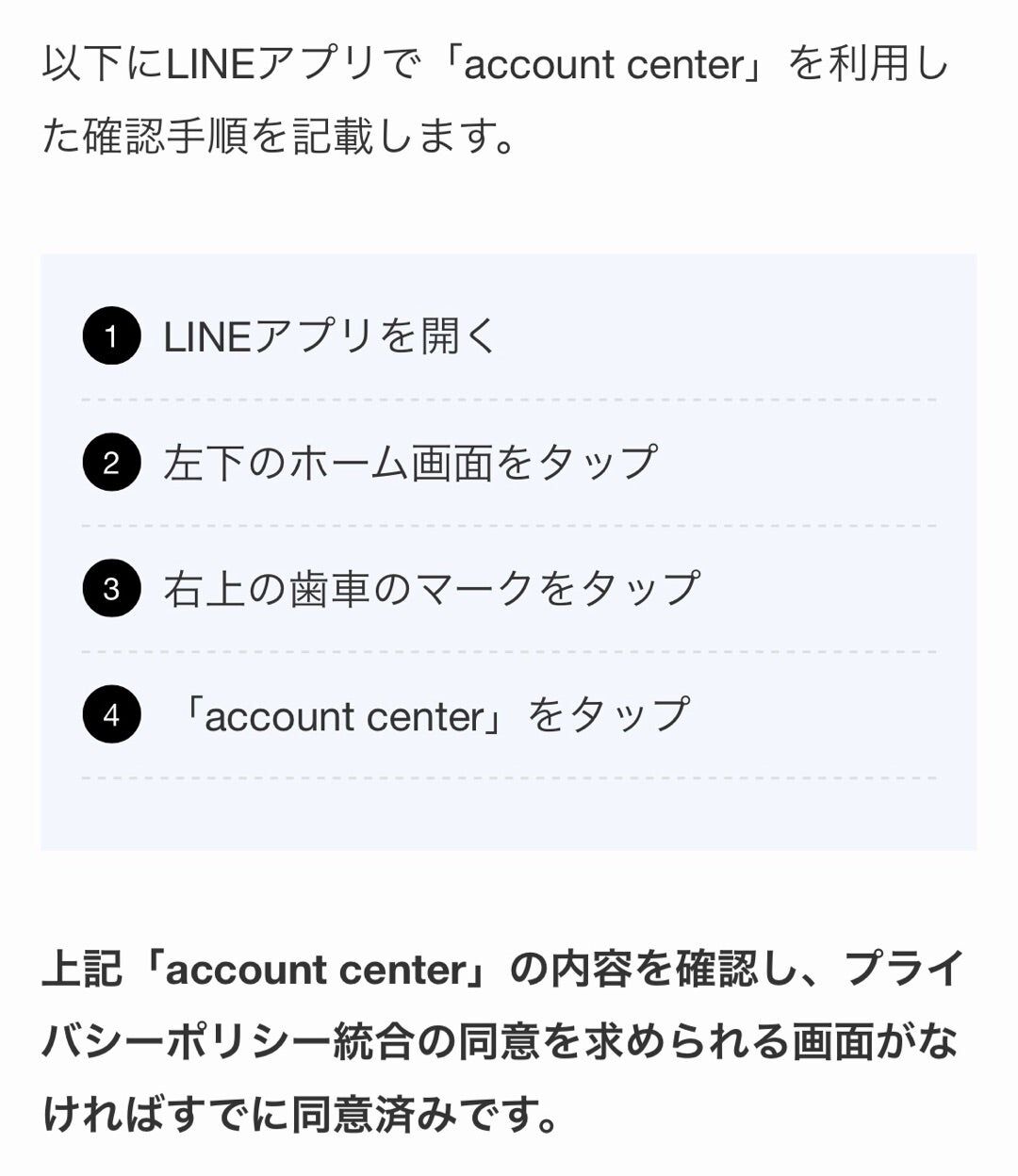 Q2.同意したか忘れた…どうしよう? →「ホーム」タブで右上の「歯車」アイコンをタップ。→「acount center」をタップから、画面を出せます。