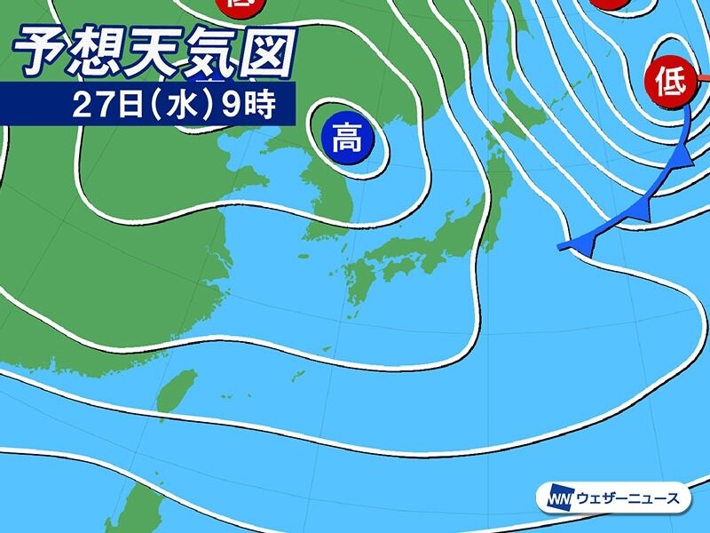 🐻✋27日(水)は小樽や留萌、北海道付近を通過した低気圧と前線が東の海上に移動。大陸からは移動性の高気圧が張り出して日本の周辺は冬型の気圧配置になります。