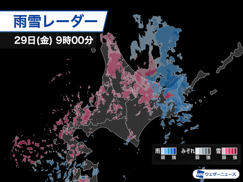 一方、29日(金)は低気圧が北海道を通過していて、低気圧の後面に入った日本海側から寒気の流れ込みが強まり、降るものが雪に変わっています。