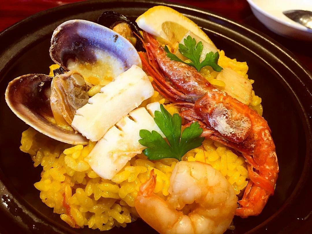 テーブル席のほか、長さ7mもの一枚板を使ったカウンターが有ります。人気のメニューは…魚介類のパエリアです。