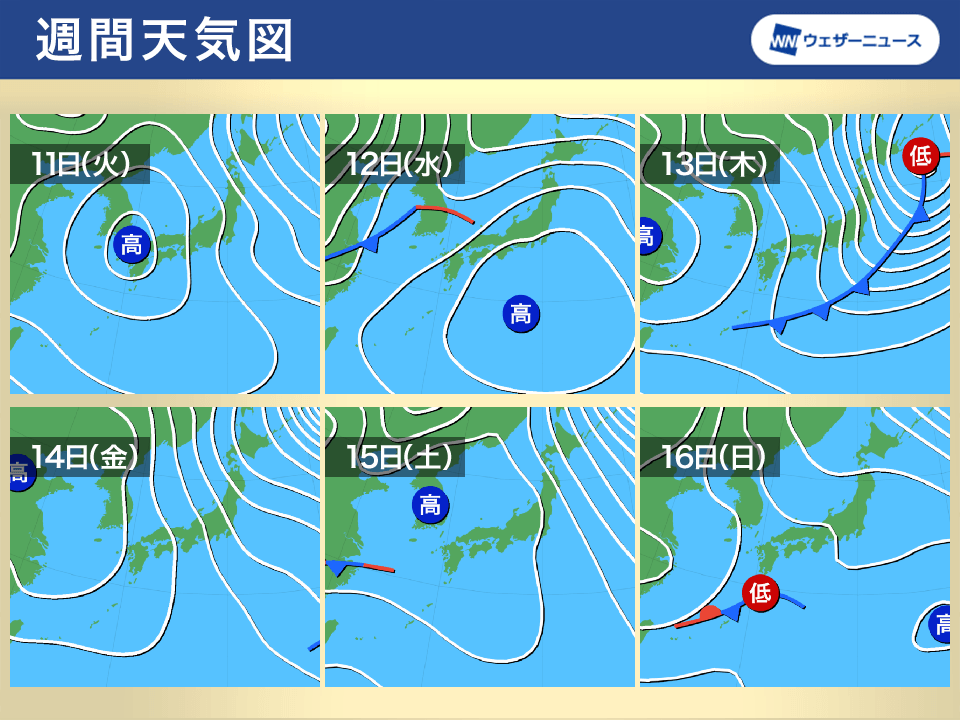 12日(水)から13日(木)にかけて低気圧が日本海から北日本付近を東進し、日本列島を前線が通過します。