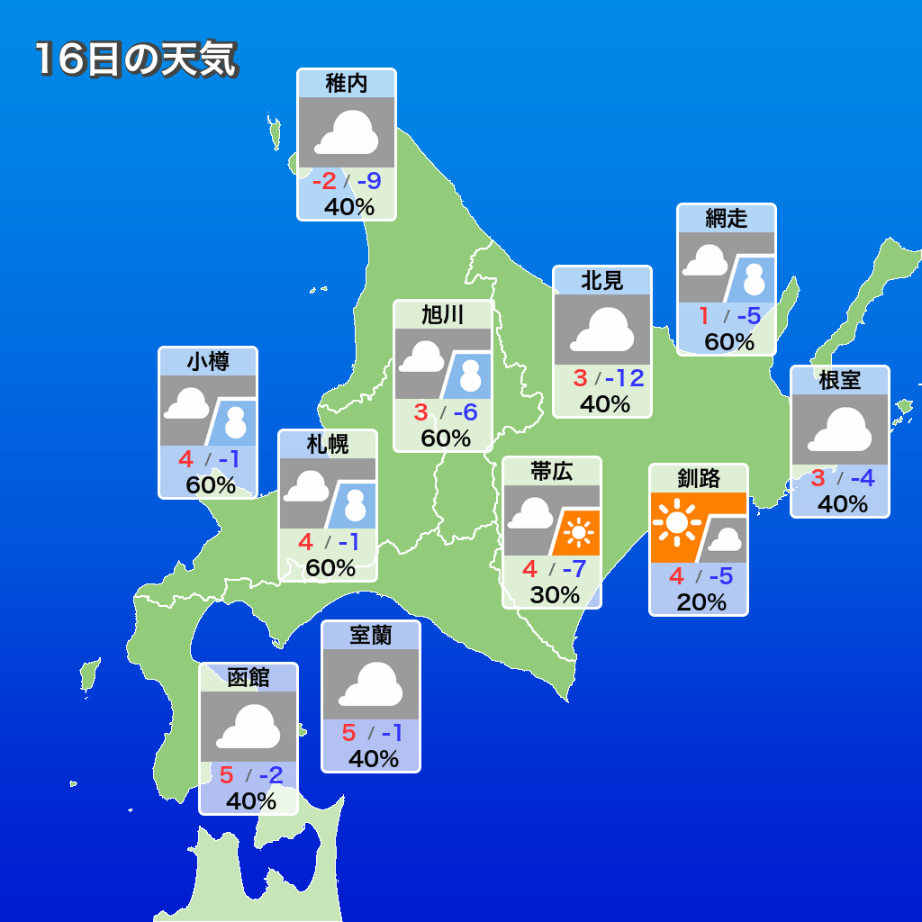朝は北陸や北海道で一時的に強く降る所があるため、路面状況の悪化や視界不良に注意をしてください。