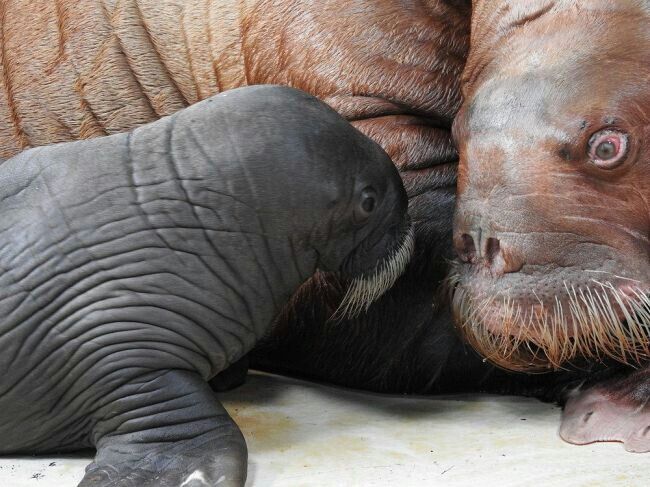 赤ちゃんは体長約85センチ、体重推定約35キロ。性別はまだ不明だ。同館によると、セイウチの妊娠期間は約14カ月で、ペアは昨年1月に交尾が確認されていた。同11月にはエコー検査を行い、ウーリャのおなかで胎児が育っていたという。