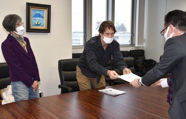 文字一志倶知安町長に要望書を提出するキース・ロジャーズさん(中央)と渡辺淳子さん(左)