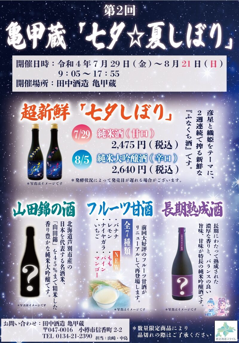 北海道・小樽の地酒をもっと知っていただきたくイベントである「亀甲蔵 七夕☆夏しぼり」を開催いたします。