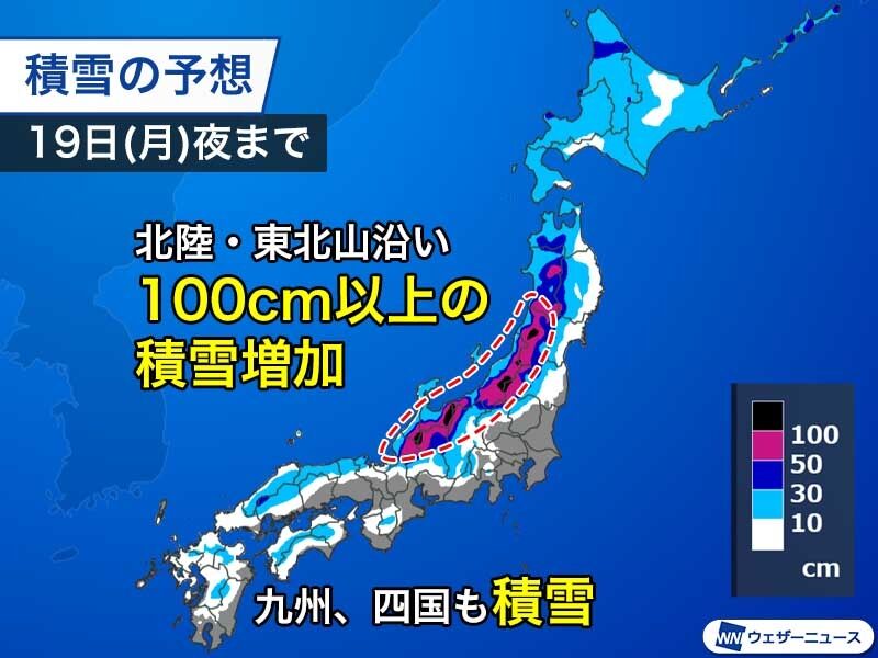 日本海側を中心に断続的に雪が降り、25日(日)夜までの積雪は北陸や東北南部の山沿いで100cm以上に達する見込みです。
