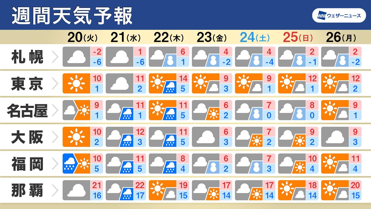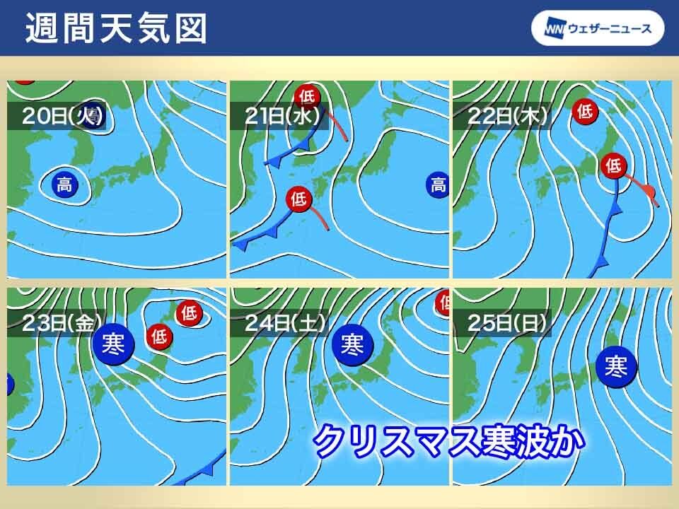 22(木)今夜から日本付近は冬型の気圧配置が続き、26日(月)にかけてクリスマス寒波で日本海側は大雪のおそれがあります。
