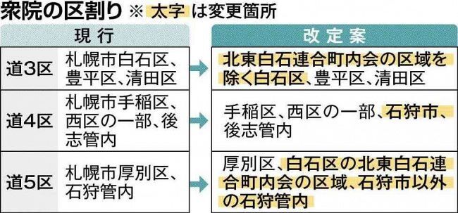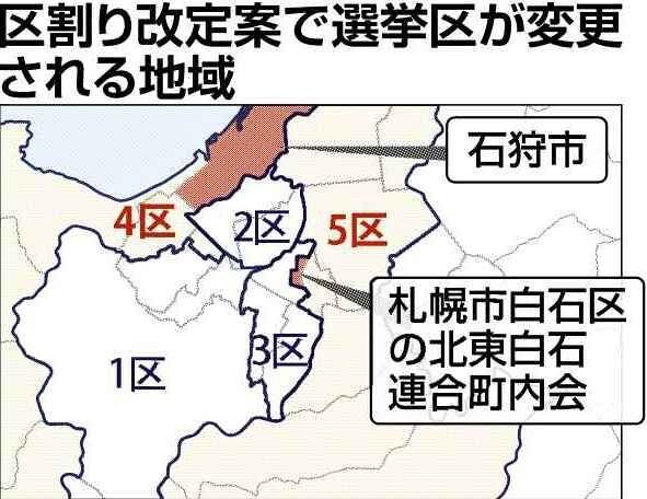 衆院選の「1票の格差」是正のため、政府の衆院選挙区画定審議会(区割り審)が6月16日に勧告した小選挙区の区割り改定案で、札幌市白石区の一部が道3区(札幌市白石区、豊平区、清田区)から道5区(同市厚別区、石狩管内)に編入されることになり、住民に懸念が出ている。