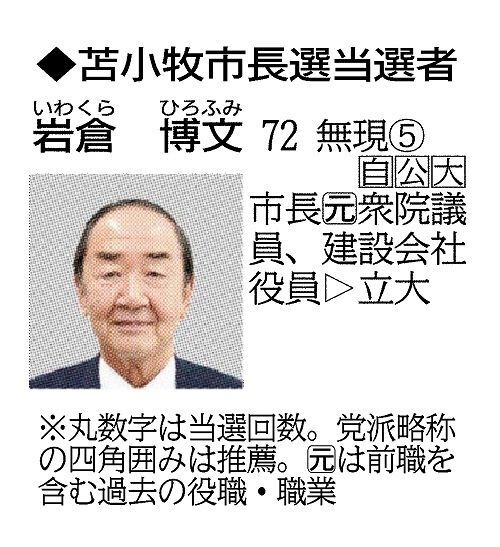 任期満了に伴う6月19日投開票の苫小牧市長選で、無所属の現職岩倉博文氏(72)(自民、公明、大地推薦)が無所属新人で元精密部品製造会社社員の西村俊寛氏(61)を破り、5選を果たした。