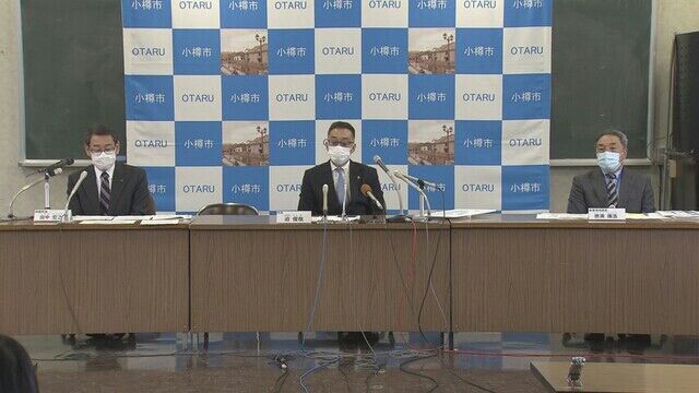 記者会見をする迫俊哉小樽市長(中央)
