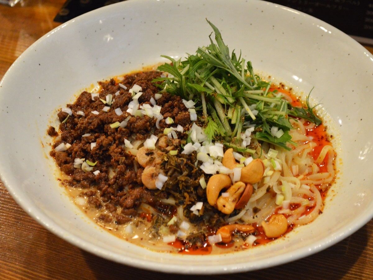 同店の担々麺はラー油とサンショウの辛さとしびれが特徴。平打ち太麺を使い、カシューナッツや水菜の食感がアクセントになっている。ラー油は中国産トウガラシと9種の香辛料を使い「深みのある味」を表現。サンショウは中川さんこだわりの中国四川省産を使う。注文時、辛さとしびれは、辛さ=0(使用しない)~6(3まで無料)、しびれ=0~15(6まで無料)の調節に対応。食べてみてから、ラー油とサンショウを足すこともできる。途中で温玉(100円)などのトッピングを投入して「味変」したり、余ったタレや汁にごはん(50円~150円)を投入したりもできる。