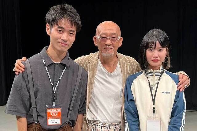 松山千春(中央)と記念写真に納まる最優秀賞の小川哲央さん(左)と優秀賞の柴牟田更沙さん