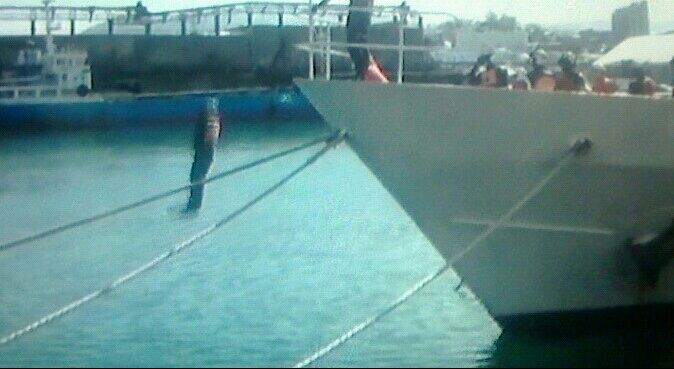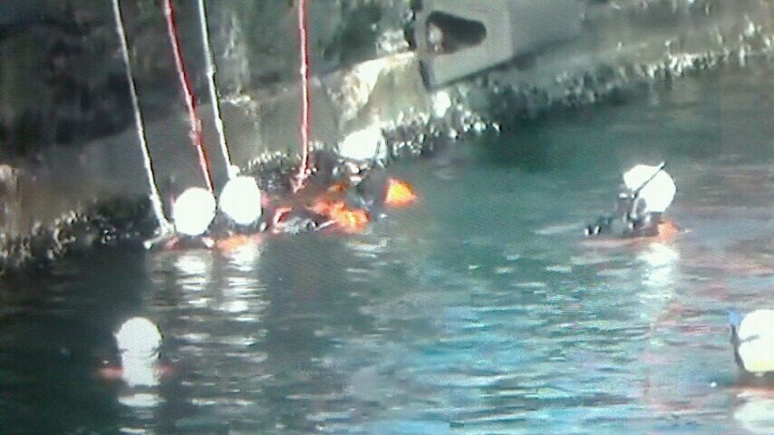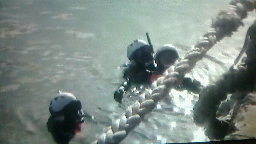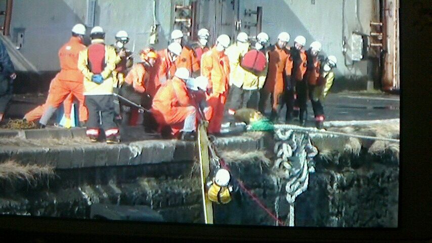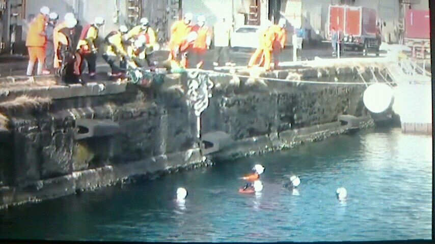 海保と消防の《潜水士》が4人づつ水中に飛び込み、2班に分かれて海底に沈めた《携帯電話》を捜索❕、《釣り人等が港から転落❕》した事案❕を想定した《引き上げ訓練❕》を行いました。