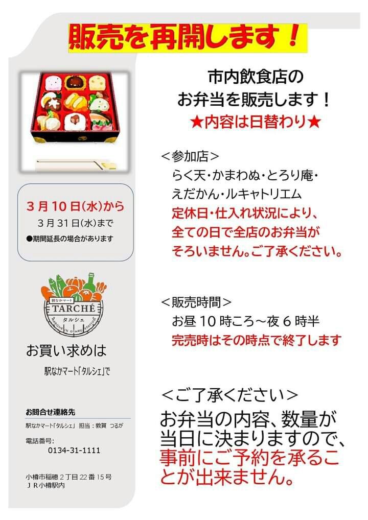 小樽市内の飲食店のお弁当販売は2月28日で弁当の販売終了となっていましたが…《好評❕❕》により、3月10日から再開❕❕しました。