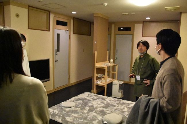 見学会の参加者にシェアハウスを紹介する歌原代表(右から2人目)