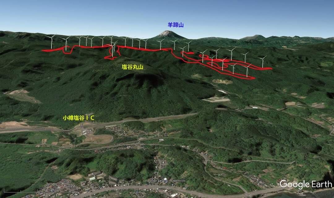 双日は‥小樽~余市の境にある塩谷毛無山周辺の国有林に約1660ヘクタールの予定地に高さ143~200メートルの風車を最大27基設置する事を計画しています。