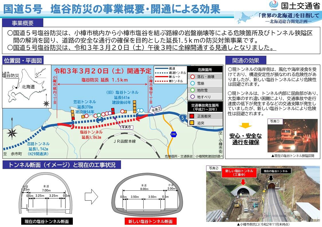 🐻👍②【小樽新塩谷トンネル3月20日開通❕】小樽開建が国道5号の小樽市桃内―塩谷間に建設していた「塩谷トンネル」(全長1063メートル)が、20日午後3時に開通する。旧トンネルの急カーブ解消や、海岸浸食による将来的な崩落回避を目的に、2015年度に着工し、6年かけ整備した。