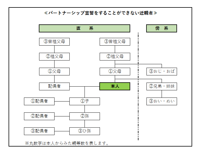 (4)二人の関係が近親者(直系血族、三親等内の傍系血族又は直系姻族)でないこと。ただし、パートナーシップに基づく養子縁組を除く。